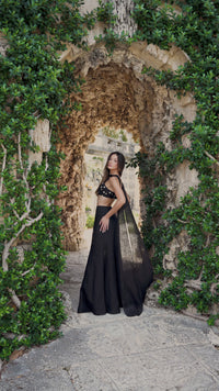 Crafted from 100% premium linen, the Conteza set merges natural elegance with meticulous detail. The structured crop top, adorned with hand-applied shell accents, brings a playful shimmer against the richness of black linen. Paired with a full-length skirt that flows effortlessly, and finished with a soft scarf detail, this look embodies breezy sophistication with a couture edge.